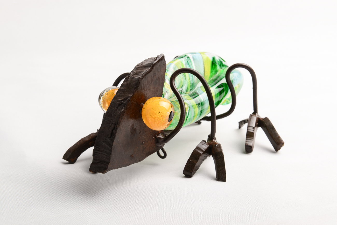 Camaleón con estructura de hierro y cuerpo de vidrio soplado. Tamaño: 20x15cm