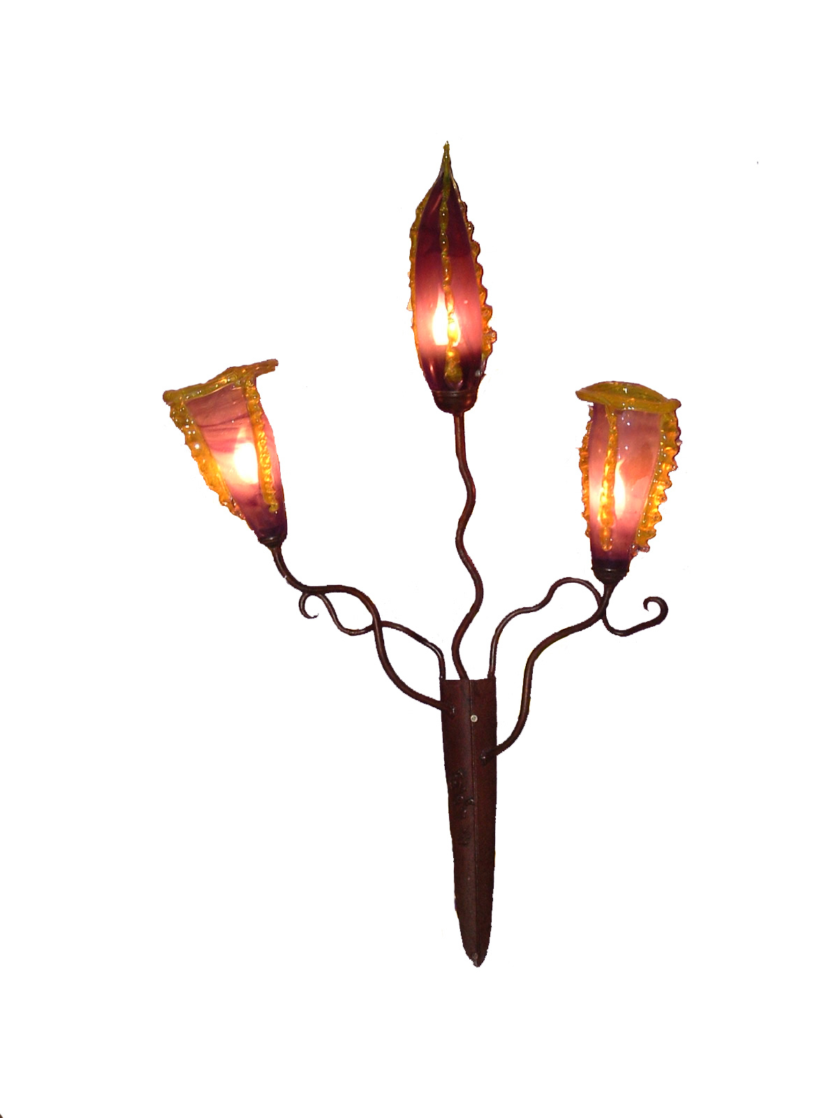 Lámpara de pared. 3 candelabros en tonos rojizos