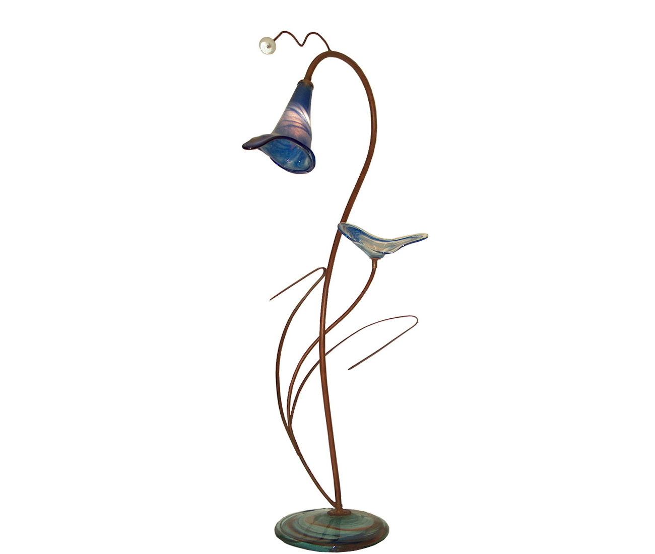 Lámpara de pié con una tulipa y una hoja en tonos azules.