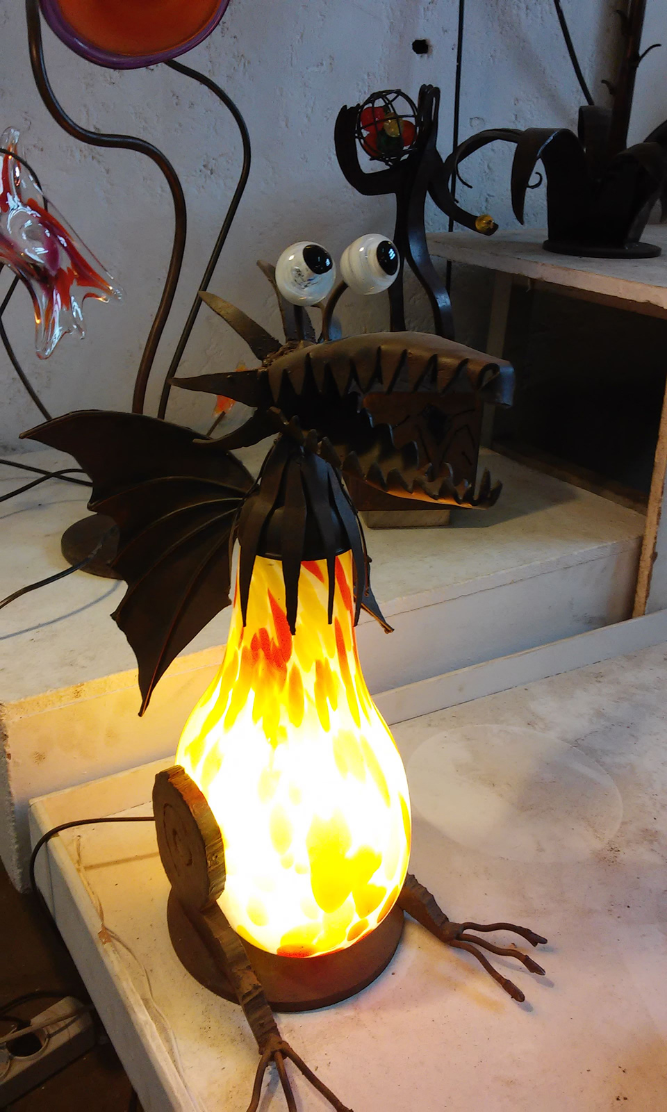 Lámparas sobre mesa. Vidrio soplado y hierro.